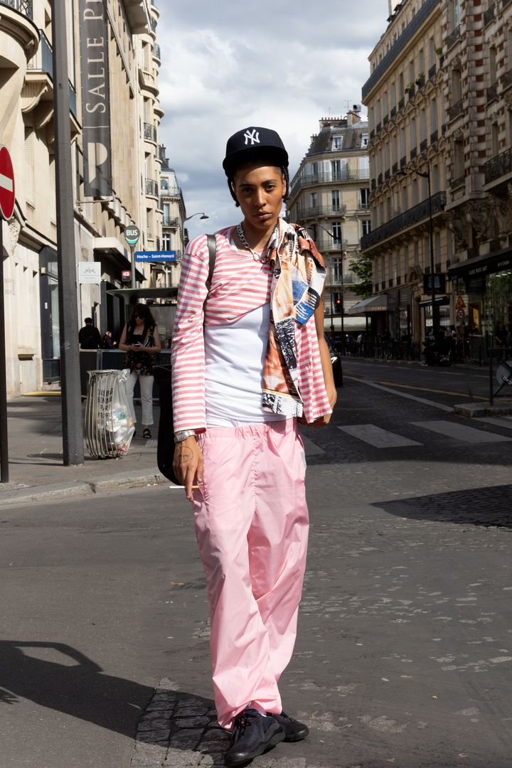 ロンドンを拠点に、詩人・アクティビスト・モデルとして活動するカイ・イサイア・ジャメルのピンクを中心に据えたレイヤードスタイルをキャッチ。ピンクのボーダーロンTをまくり上げインナーの白トップを見せ、絶妙なバランス感の上級者ルックが完成。パンツとトップをピンク系で統一する時は、キャップやシューズバッグにブラックを用いてスタイリッシュに引き締めるのも◎。