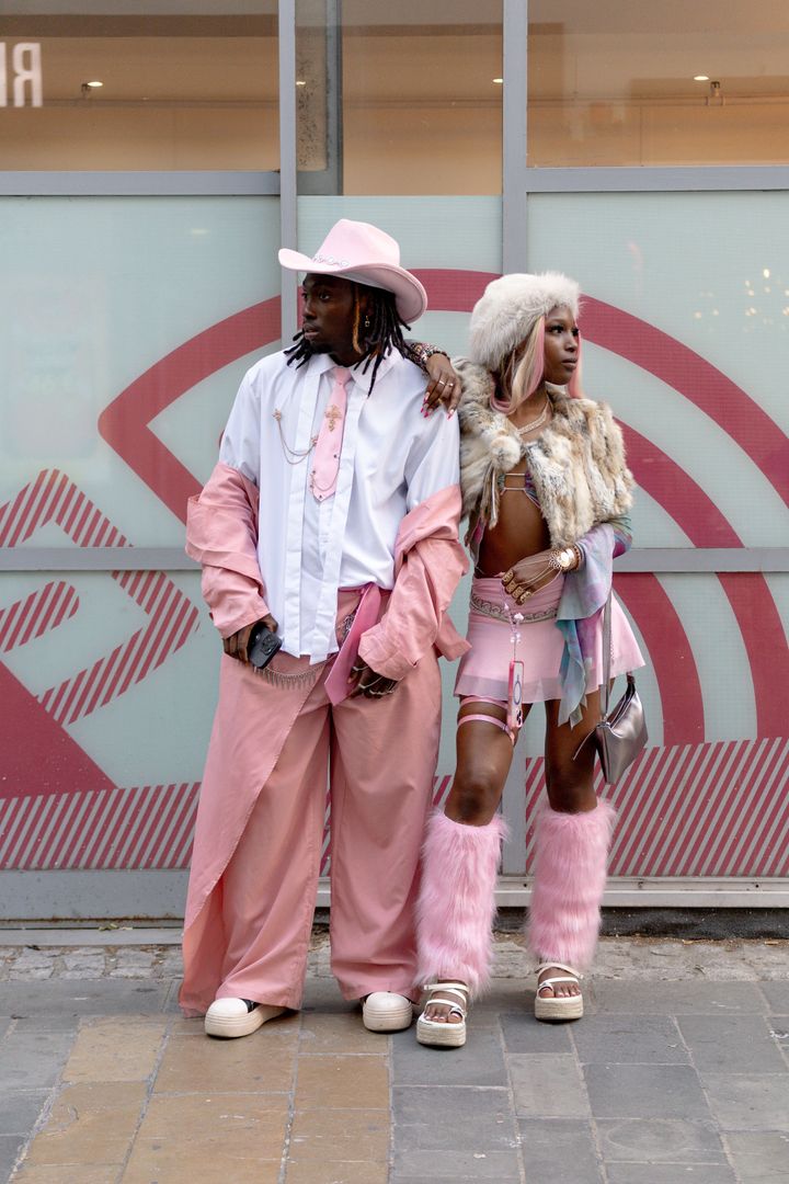 今シーズンのルイ・ヴィトンのショーに来場したビヨンセを筆頭に、カウガールないしはカウボーイのスタイルは引き続き要チェック。このスナップのふたりは、ピンクをふんだんに用いた独創的なウェスタンスタイルを披露した。クロスモチーフがあしらわれたタイやファー風の素材のレッグウェアからはY2Kのムードも感じさせる、ハイブリッドな仕上がりに。