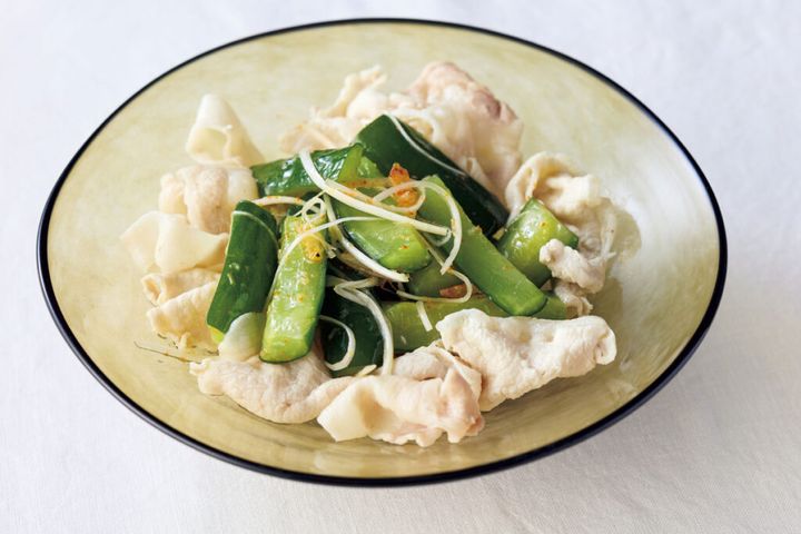 さっとゆでた豚肉に、きゅうりと桜えびの浅漬けをのせるだけで、ご飯にもそうめんなどの麺類にも合うおかずになります。