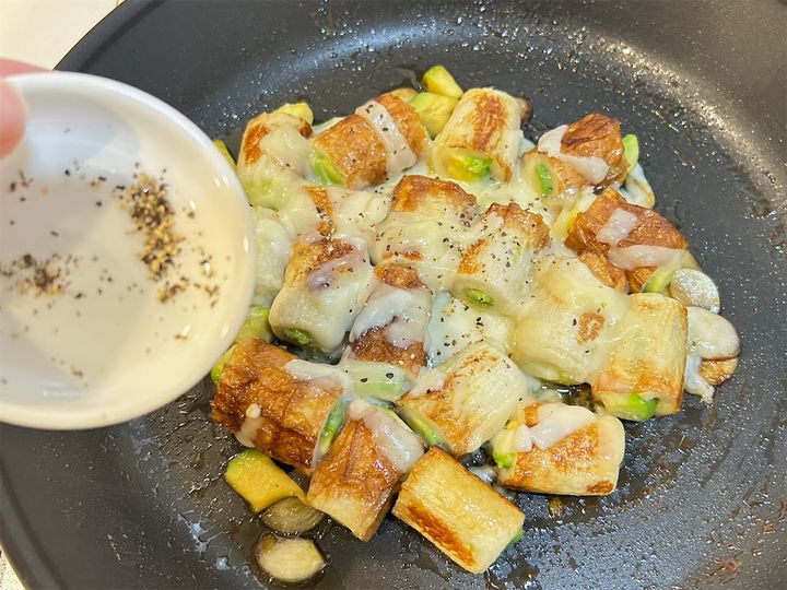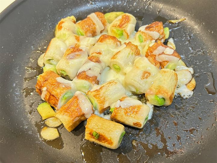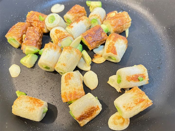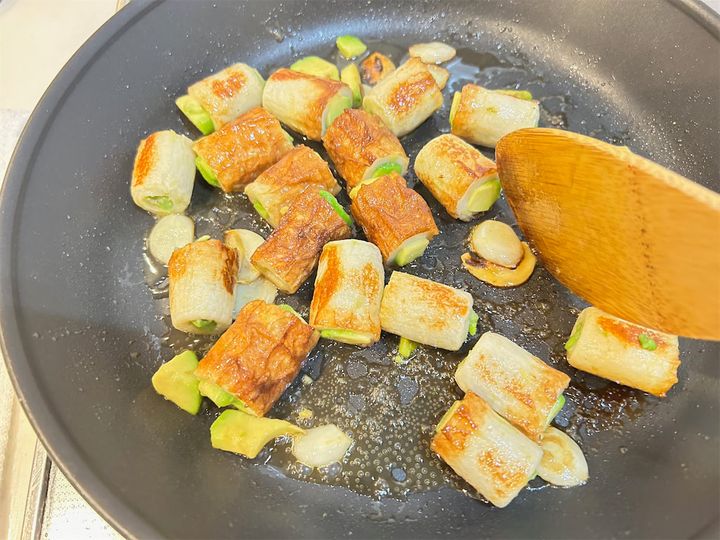 3で作ったアボちくを投入。ちくわに詰めなかったアボカドの切れ端も、一緒に焼いちゃいます。中火で3分ほど焼いていきます。