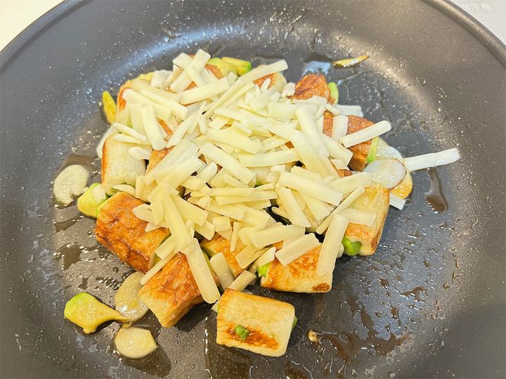 6. 火を止めて、5の上にピザ用チーズをかけて…。