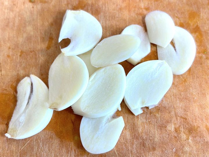 4. 今回のレシピは、にんにくを効かせるみたいですね。にんにくは、芽を取り除いて薄くスライスしました。
