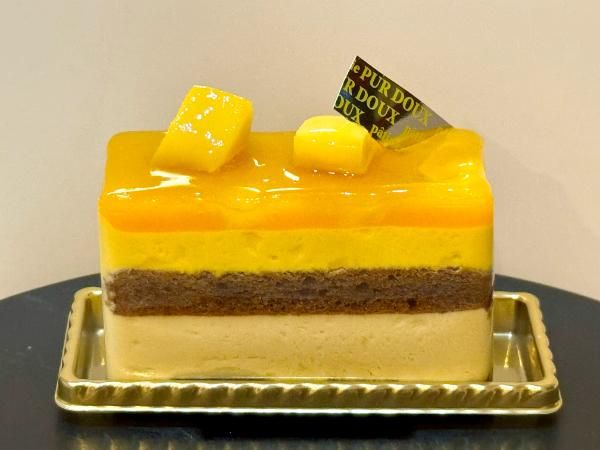 濃いオレンジ色が美しい一品。キャラメルムースと紅茶の生地に、マンゴーのムースとジュレが重なり、すっきりと爽やかな味わいです。