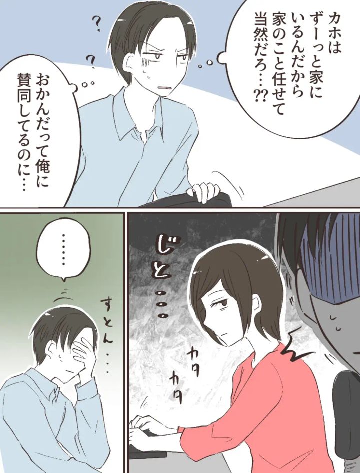 「カホはずーっと家にいるんだから、家のこと任せて当然だろ・・??おかんだってオレに賛同してるのに・・」高橋さんの言葉についてあれこれ考えながら席に戻ったキョウスケを、隣の女性社員がじっと見つめるなか、座った後もずっと考えていました。