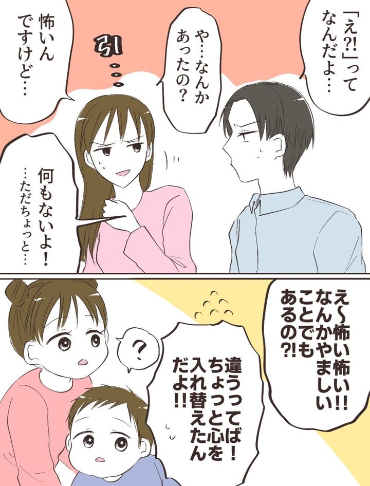 「え!?」ってなんだよ・・と不満そうに言うキョウスケに、「や・・なんかあったの?怖いんですけど・・」と引き気味の私。「何もないよ!・・ただちょっと・・」と小さな声で呟くキョウスケに、「え~怖い怖い!!なんかやましいことでもあるの!?」と聞くと、「違うってば!ちょっと心を入れ替えたんだよ!!」と言うキョウスケ。子ども達は何事かと私たちを見つめていました。