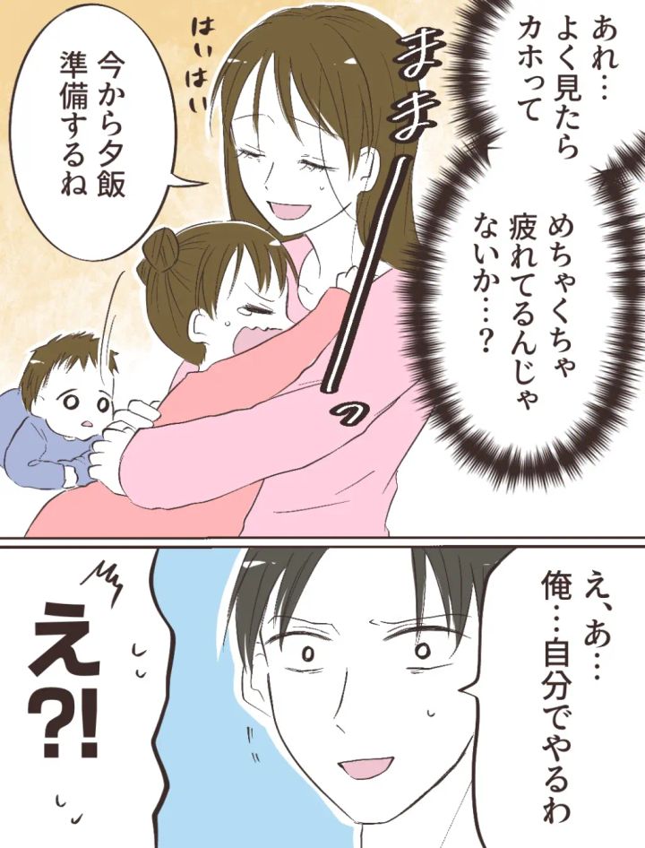 すると、「あれ・・よく見たらカホってめちゃくちゃ疲れてるんじゃないか・・?」と子ども達を抱っこして「今から夕飯準備するね」と話している私を見ていたようで、咄嗟に「え、あ・・俺・・自分でやるわ」と言うキョウスケに、「え!?」と驚いてしまいました。