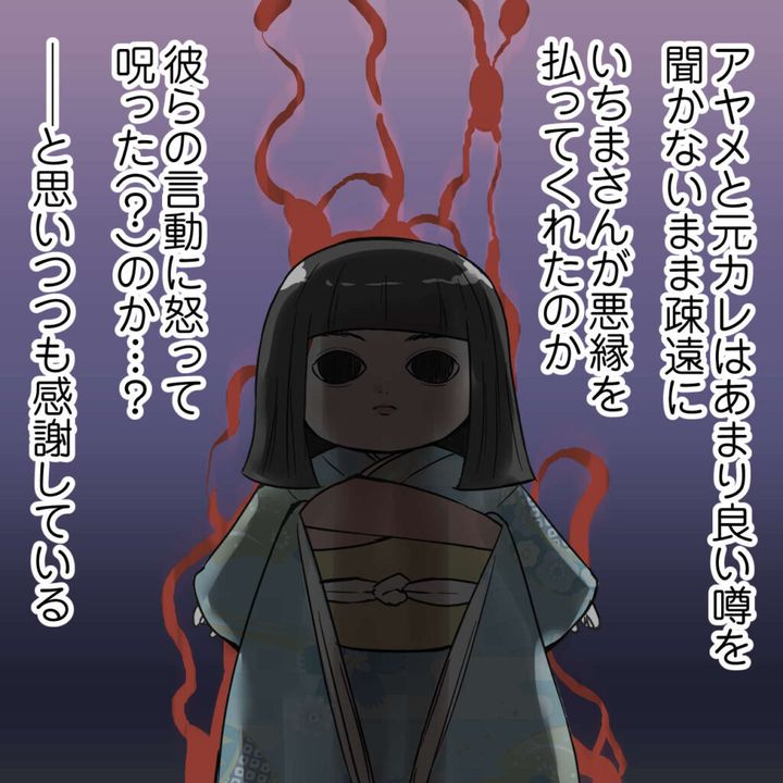 アヤメと元カレは、あまり良い噂を聞かないまま疎遠に。いちまさんが悪縁を払ってくれたのか、彼らの言動に怒って呪った(?)のか・・?