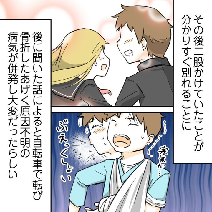 その後、二股をかけていたことが判明しすぐ別れることに。後に聞いた話によると、自転車で転び骨折したあげく、原因うh名の病気が併発して大変だったようでした。
