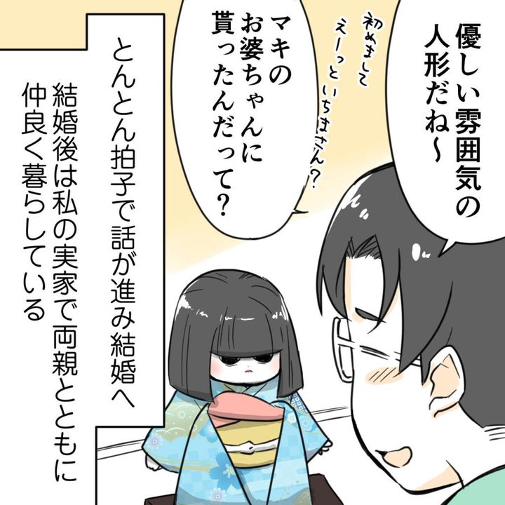 「優しい雰囲気の二人形だね~。はじめまして。えーっといちまさん?マキのおばあちゃんに貰ったんだって?」と優しくいちまさんに話しかけた彼。