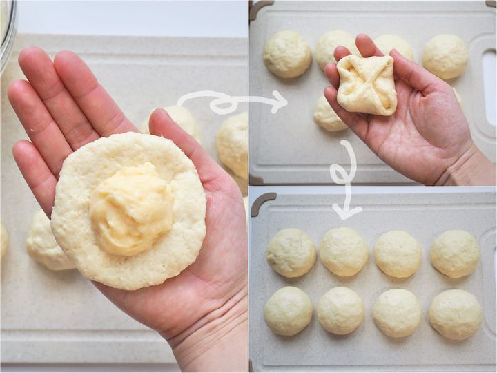 生地を中央に集めるように包み、口をしっかりつまんで閉じてから、両手でやさしくコロコロと形を丸く整えます。口をしっかり閉じないと、揚げたときにふくらみ、形が崩れてしまいます。カスタードクリームも、入れすぎると漏れるので注意。やわらかさによって包みやすさは変わりますが、動画では中スプーンに軽く2杯くらいを目安にしていました。