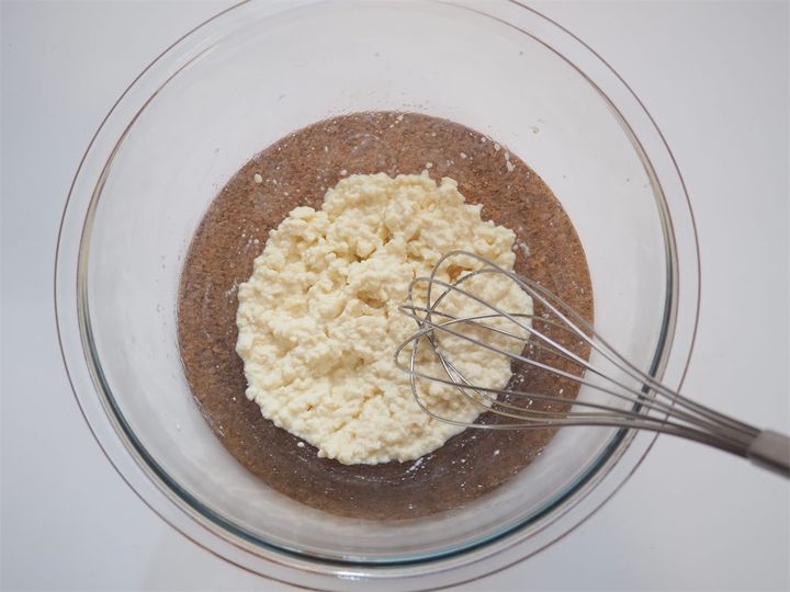 6. 1の豆腐のキッチンペーパーをとり、ボウルに入れ、泡立て器でしっかり潰していく。