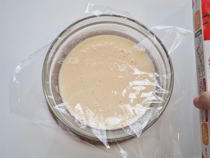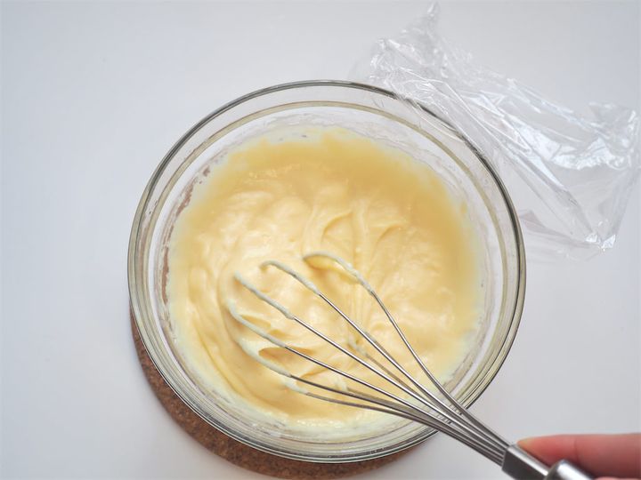 5. 4を電子レンジからとりだしたら軽く混ぜ、再度電子レンジ600Wで1分加熱する。加熱が終わったら電子レンジからとりだし、なめらかになるまでよく混ぜて、ラップをピッタリとつけて粗熱とってから、冷蔵庫で冷やしておく。
