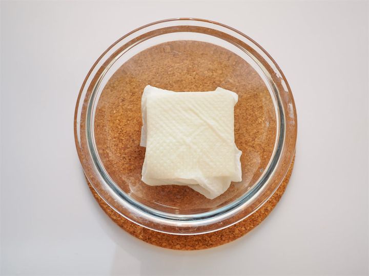 1. キッチンペーパーで豆腐を包み耐熱容器に入れ、電子レンジ600Wで2分加熱する。加熱し終わったら電子レンジから取り出し、そのまま常温で粗熱をとる。