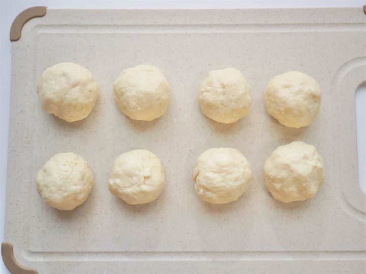 初めに丸めてから半分、さらに半分と分けて8等分にします。まんまるkitchenさんはこのとき、分けた生地を置いておくためのお皿に、くっつき防止のためラップをしていました。筆者はまな板を使いましたが、特にくっつくことはなかったです。