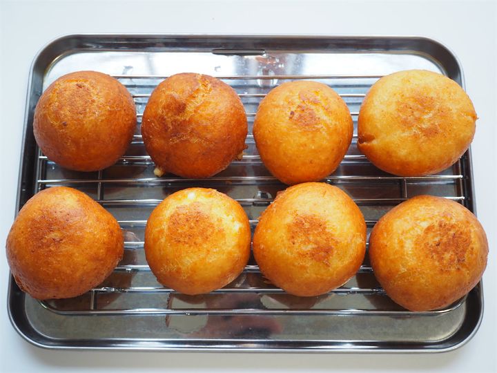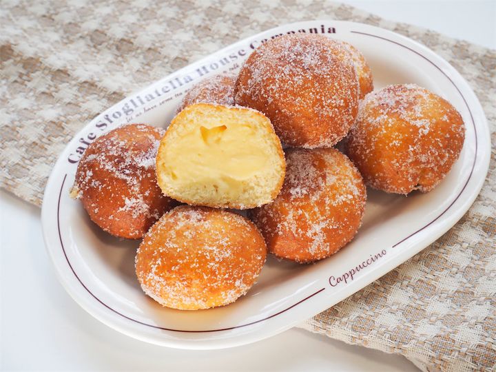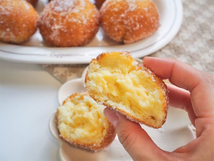 また、まんまるkitchenさんによると、カスタードの代わりにあんこを詰めたり、具を入れずにきな粉やココアをまぶすのもおすすめとのこと。個人的には、ホイップクリームをあとから注入してもよさそうだし、面倒なときはディップして食べても◎。シナモンシュガーをまぶしたり、生地自体にココアや抹茶パウダーを混ぜて風味を変えるのもいいかもと感じました。“おうちドーナツ“の楽しみが広がるレシピでした。