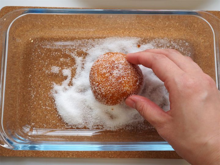 11. 揚げ終えたらバットやキッチンペーパーの上で油を切り、粗熱がとれたらグラニュー糖を全体につけて完成!