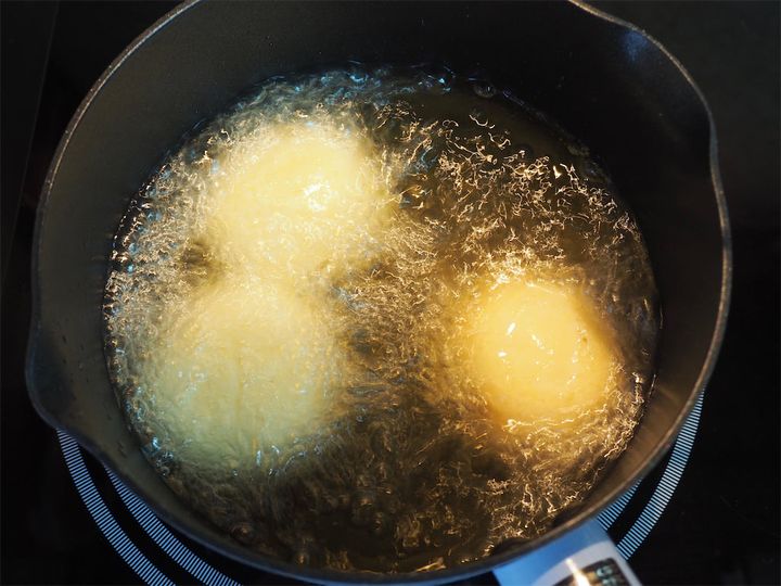 10. 鍋に揚げ油をたっぷり入れたら火にかけ、170℃に温める。温まったら、9のドーナツを入れ、きつね色になるまで揚げていく。
