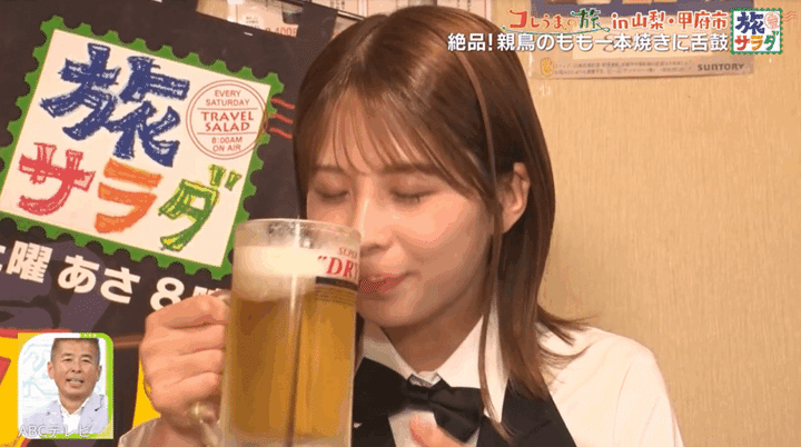 ABCテレビの大仁田美咲アナウンサーが、旅バラエティ番組『朝だ!生です旅サラダ』(ABCテレビ)で、運命的な出会いを果たした!? 生ビールと焼き鳥をおいしそうに味わう彼女に「暑さも吹き飛ぶべらぼーなかわいさ満点」「これからもガンガン飲んで」などと、多くの視聴者がトリコになった。