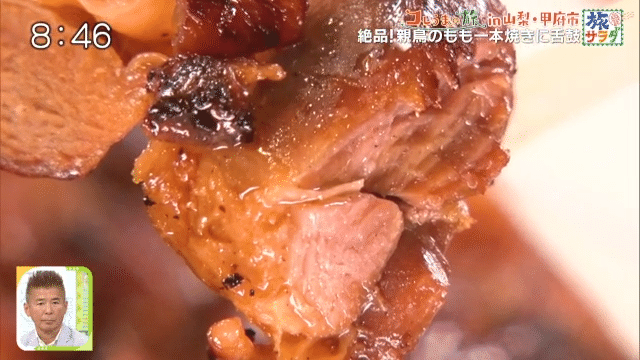 名物のもも焼きは、歯応えのある親どりと、プリッとした若どりの2種類があり、甘辛い秘伝のタレが味の決め手だ。地元民に人気の親もも焼きを試食した大仁田アナは、「うわ~おいし~!」と瞳を輝かせて大喜び。「丸焼きだからこその肉汁の量!」「噛めば噛むほど『これでもか!』と奥から旨味が出てきますね!」「弾力がしっかりしているんですけど、柔らかい。味がなくならない。ずっと味がする!」などと称賛した。