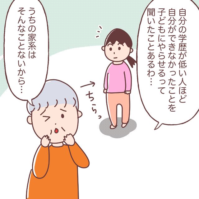 「自分の学歴が低い人ほど自分ができなかったことを子どもにやらせるって聞いたことあるわ・・・」私をチラ見しながら言いました。そして「うちの家系はそんなことないから・・・」と意味深に言葉を濁しました。何を言いたいか想像できますよ、お義母さん。