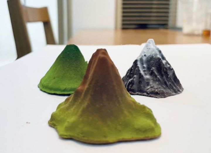 井之脇さんの取材で使った、山のジオラマの正体は、実はチョコレート。写真に写っている3つは、<桜島 御岳><利尻山><八丈島 西山>それぞれの山がモチーフになっているそう。