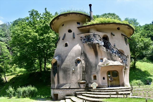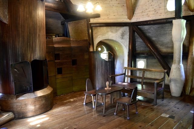名前の通り、きのこのような丸みを帯びた形が印象的な建物。内部は、誰かが暮らしているかのようにキッチンやテーブル、暖炉が置かれ、細部までこだわりを感じます。