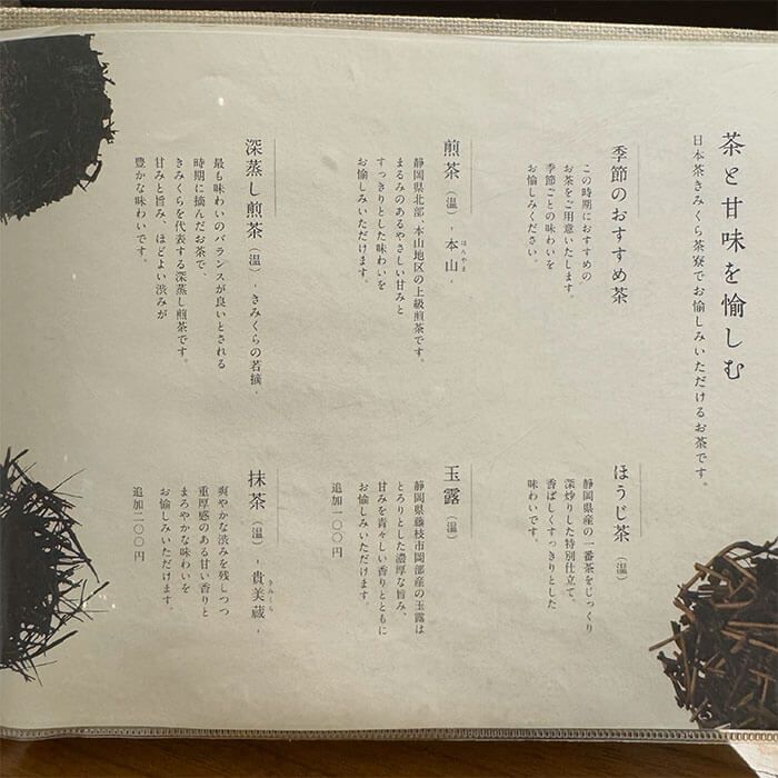 お茶と甘味を楽しむことができ、お茶は6種類から選べました。
