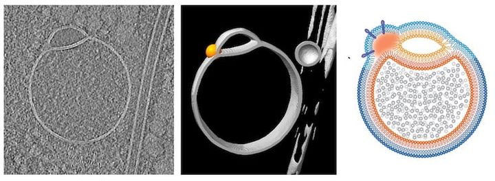 小さな小胞(袋のような構造)が、大きな小胞にくっつくように並び、その接合部には「半融合(ヘミフュージョン)」と呼ばれる特殊な膜の境界ができていました。