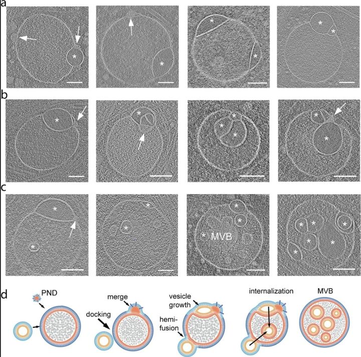 細胞内で自由に漂っていたPNDが、ある場所にとどまり、そこに小さな袋を生み出し、ヘミフュソームの形成を促している可能性があるのです。