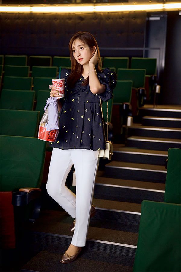 【雨の日の映画館デート】に最適な甘カジュコーデ♪さわやかな印象の花柄ブラウスで女性らしい華感を