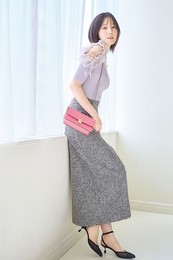 チラリと肌がのぞく袖のカッティングに、華奢なリボンをトッピング。フリルの縁取りとあいまって、視線を引き付ける映えアクセントに。スマートなシルエットのペンシルスカートを合わせてほどよく糖度オフして。