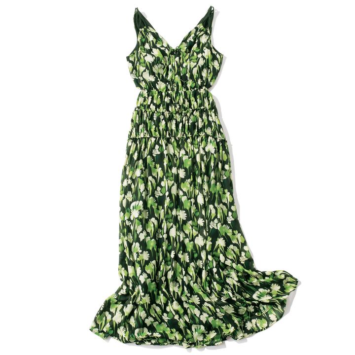 旅をしたくなるドラマティックなワンピース。華奢な肩紐や脇腹のスリットなどレディなムードを盛り上げるディテールが光ります。取り外し可能なカップ付きで一枚で着用もOK。ワンピース¥35,200(エステラケイ/ジャミン)