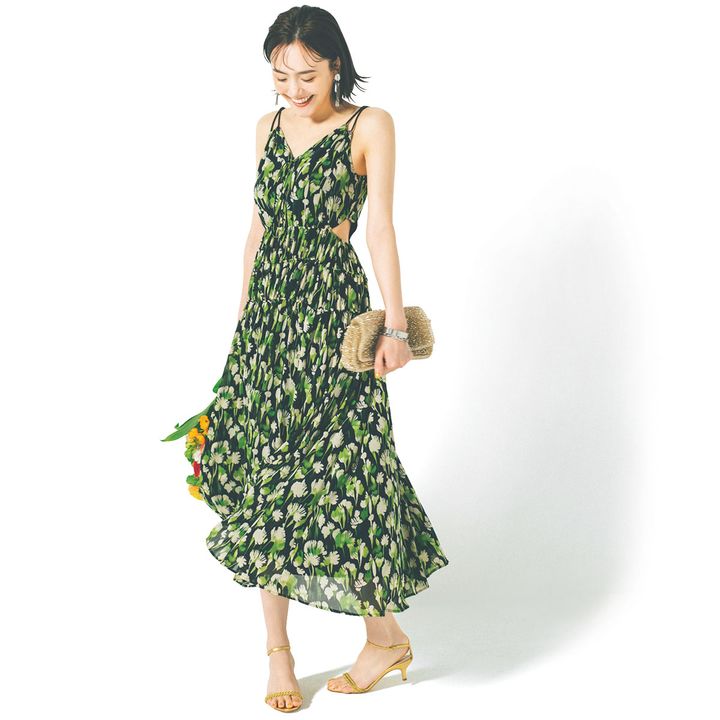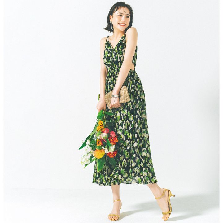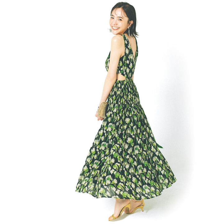 リゾートらしく露出度はちょっぴり高めに。脇腹や背中の肌見せなら、上品にきまります。ヘアやメイクには艶感を足して、明るくヘルシーにお祝いムードを盛り上げて。ワンピースは右下を着回し バッグ¥79,200(アンテプリマ/ワイヤーバッグ/アンテプリマジャパン)サンダル¥64,900(ネブローニ)イヤリング¥4,860ブレスレット¥7,150バングル¥8,640(すべてアビステ)