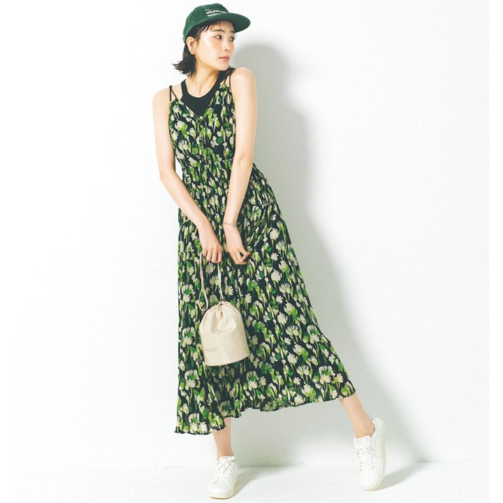 普段のお出かけに着るときはインナーを挟んで露出度を調節。カジュアルアイテムと合わせて、いつものメンバーと思いっきり楽しみたい夏のイベントに。ワンピース 右を着回し タンクトップ¥2,290(UNIQLO)キャップ¥6,600(エルドゥ/キャビアプロダクツ)バッグ¥19,800(ヴァジック/ヴァジックジャパン)スニーカー¥6,050(ヒュンメル/エスエスケイ お客様相談室)ブレスレット¥27,500(フィリアム/フォーティーン ショールーム)