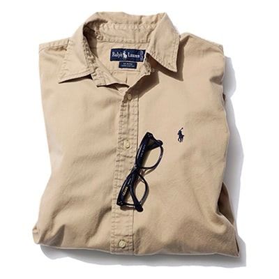 「白Tに白のハーフパンツを合わせて、ばさっとこのシャツを重ねたい。白だけでなく、コクのあるベージュだから、柄をはじめキレイな色とも合わせやすい。ラルフのメンズのルックに出てきそうなスタイリングがイメージです。シャツのパッチと色リンクしたネイビーの眼鏡で知的に装うのもあり」(樋口さん)