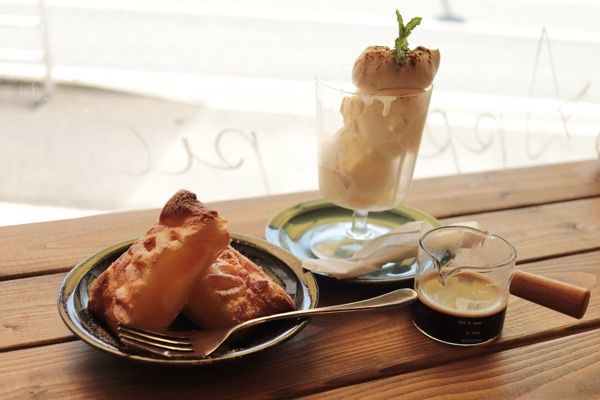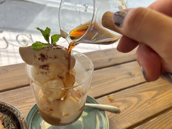 パリパリサクサクのパイ生地に、ごろっと大きめのりんごが贅沢に包まれています! ほんのりした甘さが絶妙で、とっても美味しい! お次は、冷たいアイスとホイップクリームに濃厚なエスプレッソをかけていただくアフォガード。