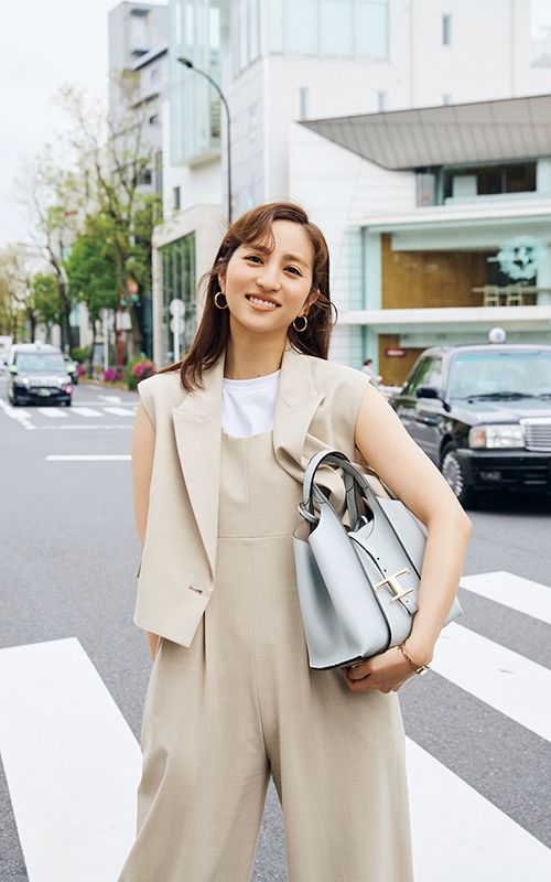 サンダル¥116,600 バッグ¥278,000(ともにトッズ/トッズ・ジャパン)ジレ¥35,200 サロペット¥46,200(ともにアルアバイル)カットソー¥6,930(バルミーディス フォービューティー&ユース/ビューティー&ユース ユナイテッドアローズ 丸の内店)ピアス¥41,800(ミチ ウィルウェイ/フォーティーン ショールーム)時計¥27,500(マトゥー/エイチエムエスウォッチストア 表参道)