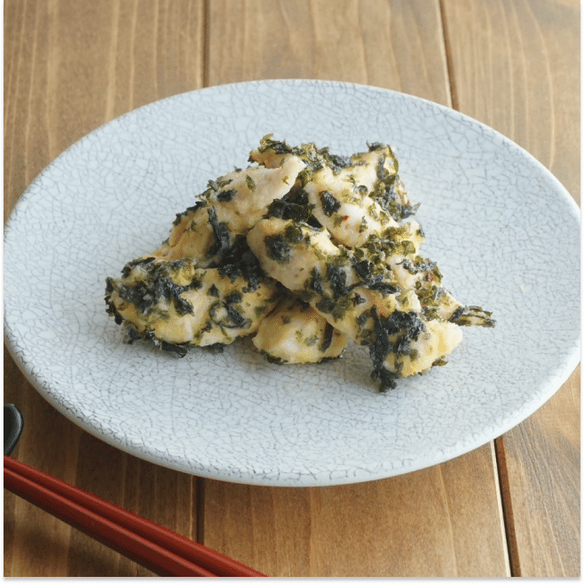 鶏肉は、スティック状にして調理したので、子どもにも食べやすく大好評◎。口に入れると、磯の香りが広がります。海苔がアクセントになり、ビールのお供にも最高です!