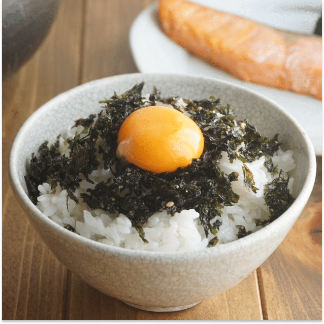 まずは、『 ふりかける熟成ジャバンのり 30g』をたまごかけごはんにトッピング! しっかり味がついているので、これだけでごはんが進みます。