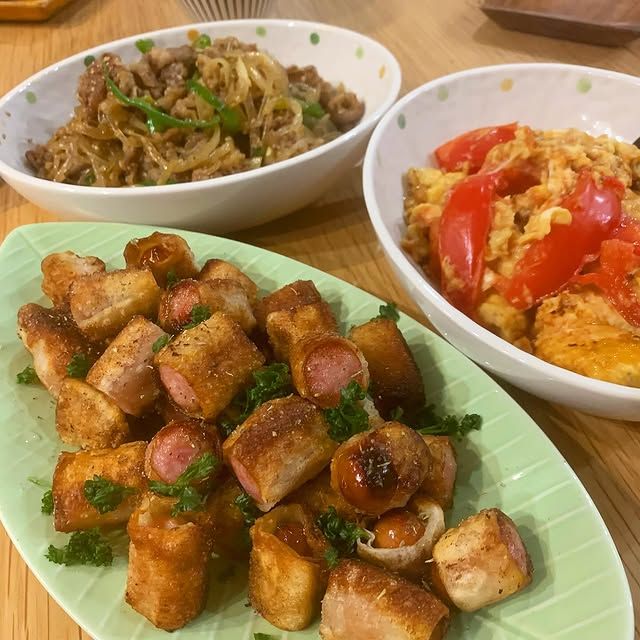 ソーセージを餃子の皮や春巻きの皮で包み、一口大に切って揚げ焼きに。
