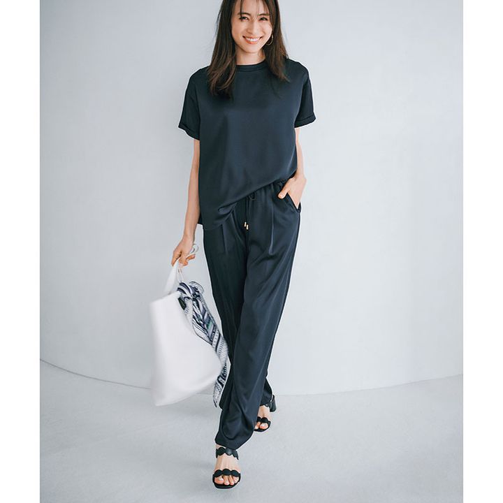 ほどよい光沢のサテンTシャツは ストレッチ性があり動きやすさ◎。 ネイビーのセットアップが上品