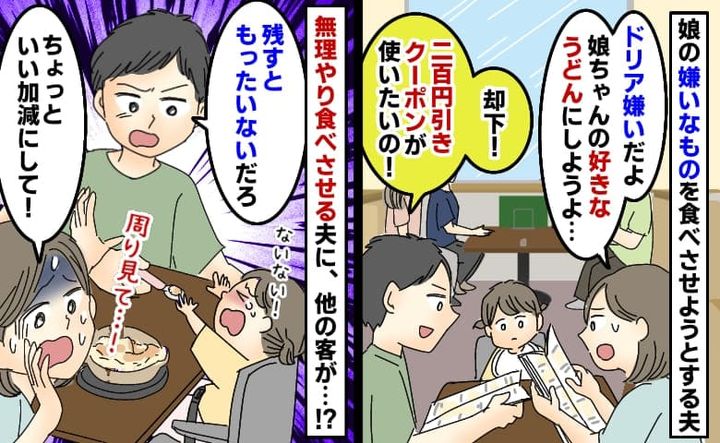 娘が嫌いなドリアを食べさせたい夫「クーポンで安く済むんだ!」無理やり口に運ぶ夫を見た他の客が!?