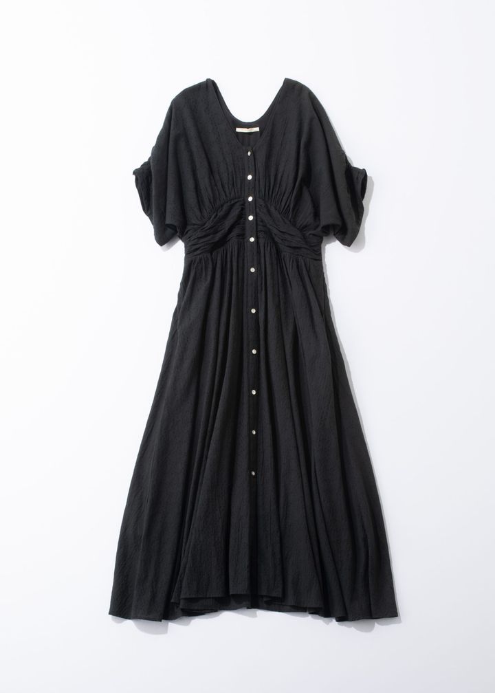 軽やかなコットンジャガード素材が上品な黒に映える一着。ウエストギャザーで美しいシルエットを作ります。ビーチサイドのディナーやリゾート散策にもぴったりのドレスで、一枚で洗練されたムードを叶えます。