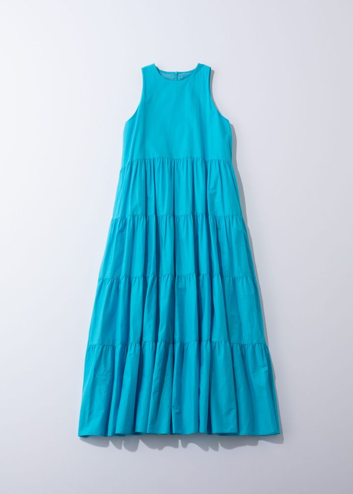 夏空に映える、洗練ターコイズ!軽やかなティアードシルエットが優雅に揺れる、ロングワンピースです。クルーネックの程よい抜け感とアメリカンスリーブが、ヘルシーな肌見せを演出します。リゾートからタウンユースまで、1枚で旬のムードを纏えるサマーアイコン。