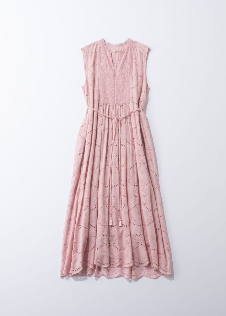 軽やかなコットンボイル素材に繊細な刺繍をあしらったドレスは、ヌキテバらしい遊び心と上品さを両立。風をはらむノースリーブデザインが暑い季節にぴったりの涼しげな着心地です。優しいピンクカラーが肌映え抜群で、デイリーからリゾートまで幅広く活躍します。