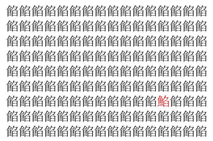 画像の中には、「餡」という漢字が縦に9行、横に16個並んでいます。 全部で144個となりますが・・・、そのうち1つは「異なる漢字」となってますよ!!