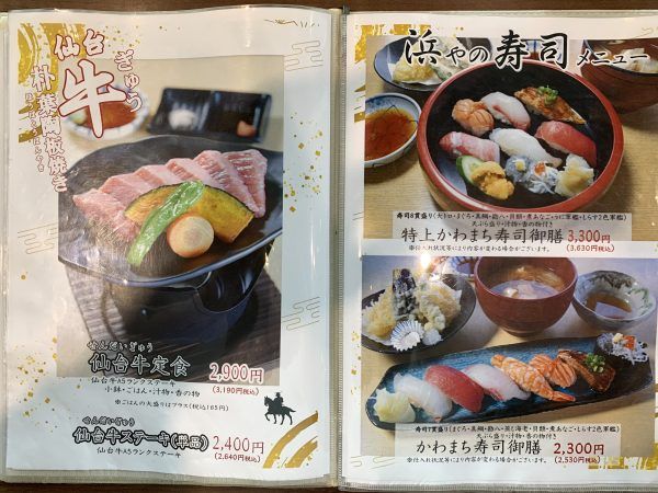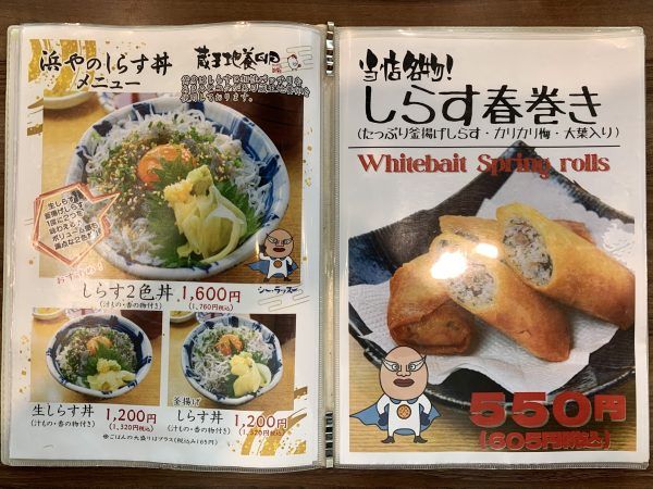 海鮮丼各種、閖上名物の生しらす、釜揚げしらす、お寿司御膳、仙台牛定食、天丼・・・迷います。