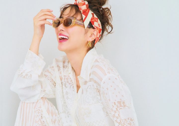 「エフ イズ フェンディ」ピアス¥100,100、「フォーエバー フェンディ」リング¥44,000、レースシャツ¥305,800、レースパンツ¥305,800、スカーフ¥35,200(シャツ、パンツともに予定価格)、サングラス¥51,700、「ミニ バゲット」 バッグ¥319,000/以上フェンディ(フェンディ ジャパン)