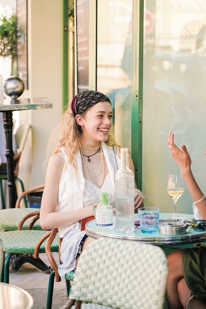 フェミニンな白のキャミソールにベストを羽織った程よい肌見せ感が好印象。スカーフのヘアアレンジや夏らしいネックレスの重ね付けで、チャーミングに!