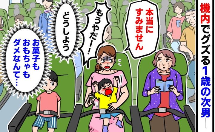 3. 機内でぐずる次男に焦る私。「うるさくてすみません…」と言いかけた瞬間、隣の女性がとったのはまさかの行動だった!